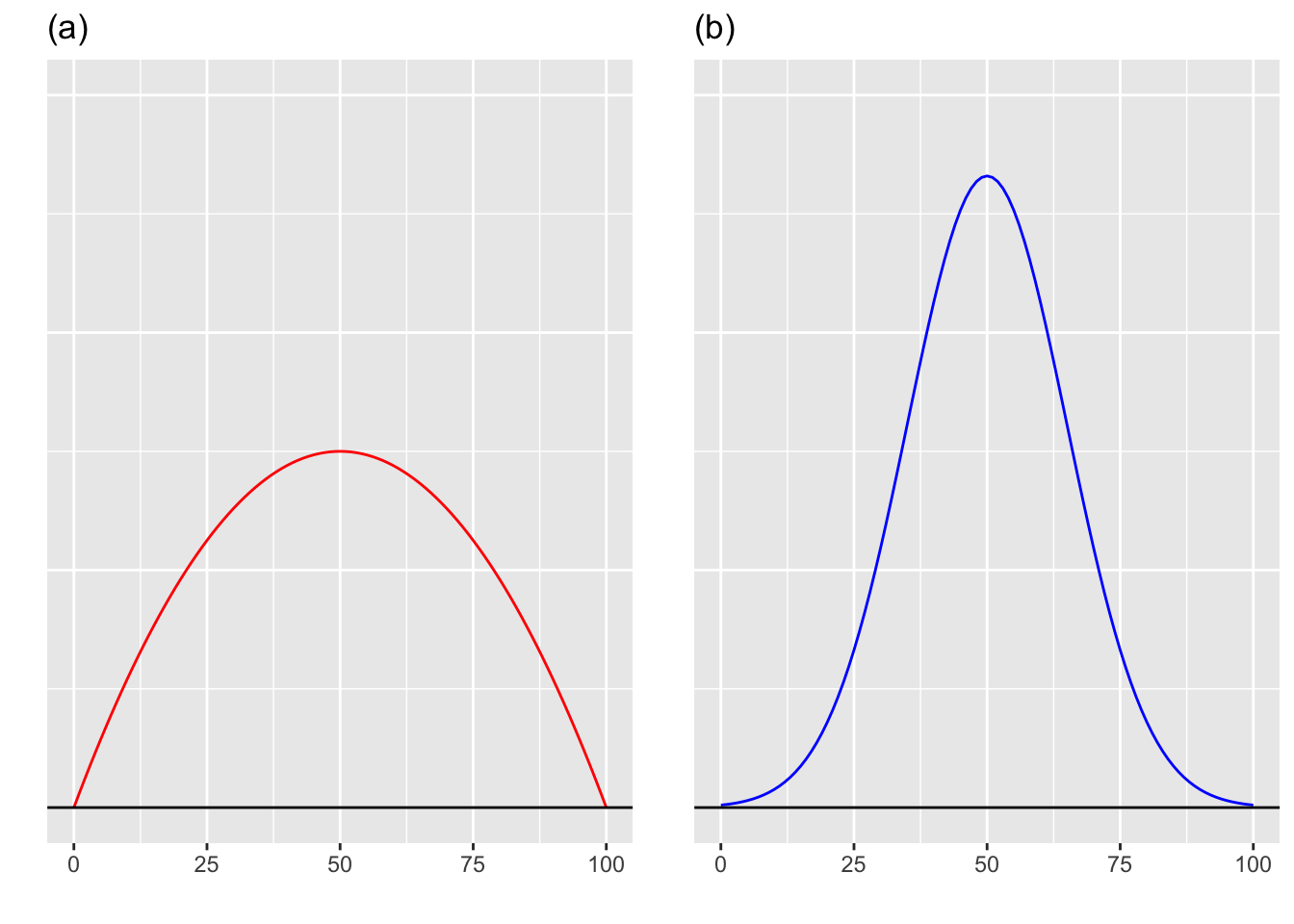 Question 4.2 (Freedman, Pisani, and Purves 2007)The two histogram sketches (density functions) are presented below. Which variable is more dispersed?